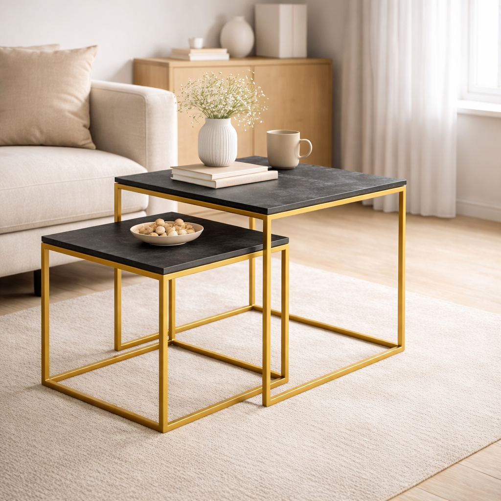 Zestaw stolików kawowych STALWELD FOR HOME to połączenie prostej geometrii, trwałych materiałów i eleganckiego wykończenia w kolorze złotym. Dwa stoliki o różnych wymiarach tworzą funkcjonalny komplet, który dopasowuje się do przestrzeni – zarówno wizualnie, jak i użytkowo.