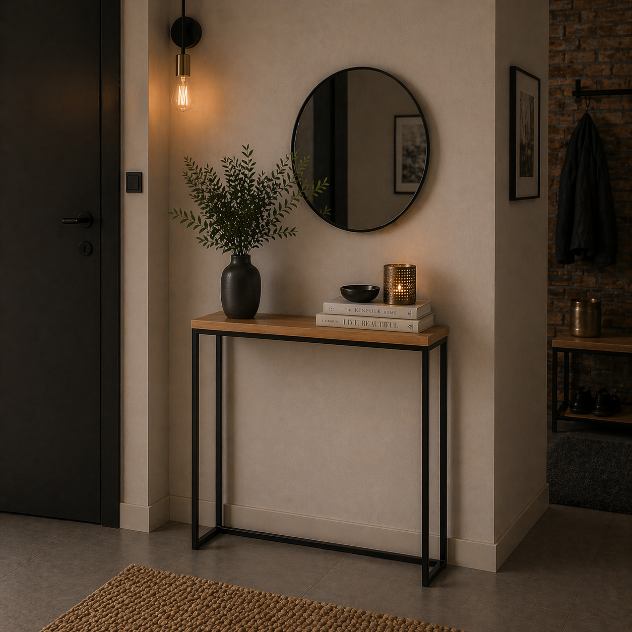 Konsolka bez dolnego łączenia w kolorze czarnym to smukły i funkcjonalny mebel zaprojektowany z myślą o wszystkich przestrzeniach. Dzięki swojej konstrukcji dobrze sprawdza się jako konsolka do przedpokoju, toaletka do sypialni lub lekki stolik dekoracyjny.