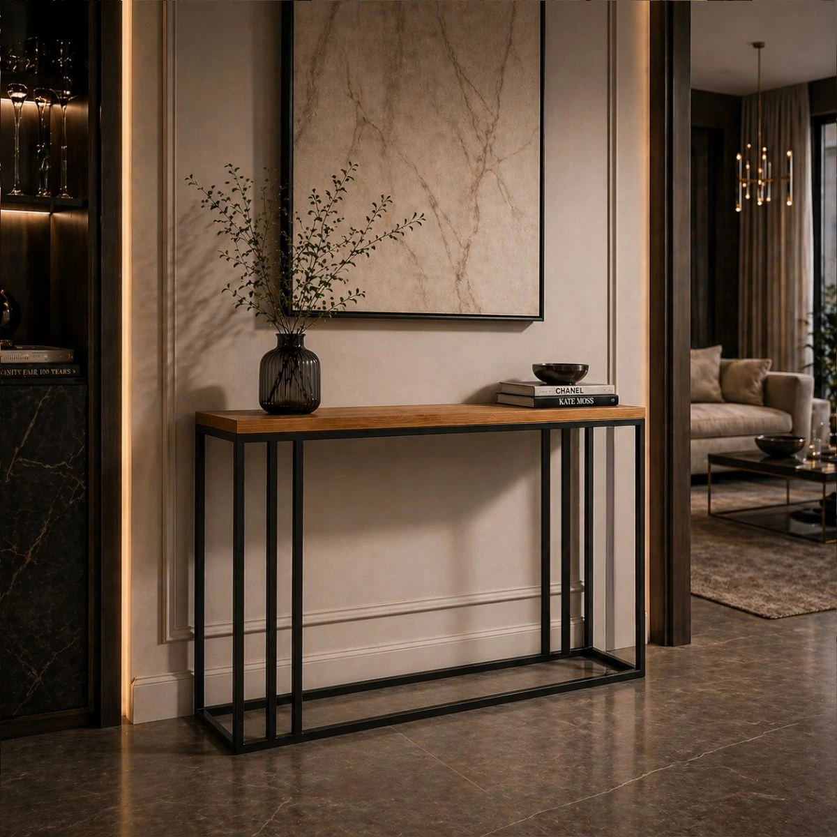 Konsolka STALWELD FOR HOME to minimalistyczny mebel o stalowej konstrukcji, wzbogacony o dodatkowe profile pełniące funkcję zarówno wzmacniającą, jak i estetyczną. Prosta forma połączona z geometrycznymi detalami nadaje całości bardziej wyrazisty charakter.