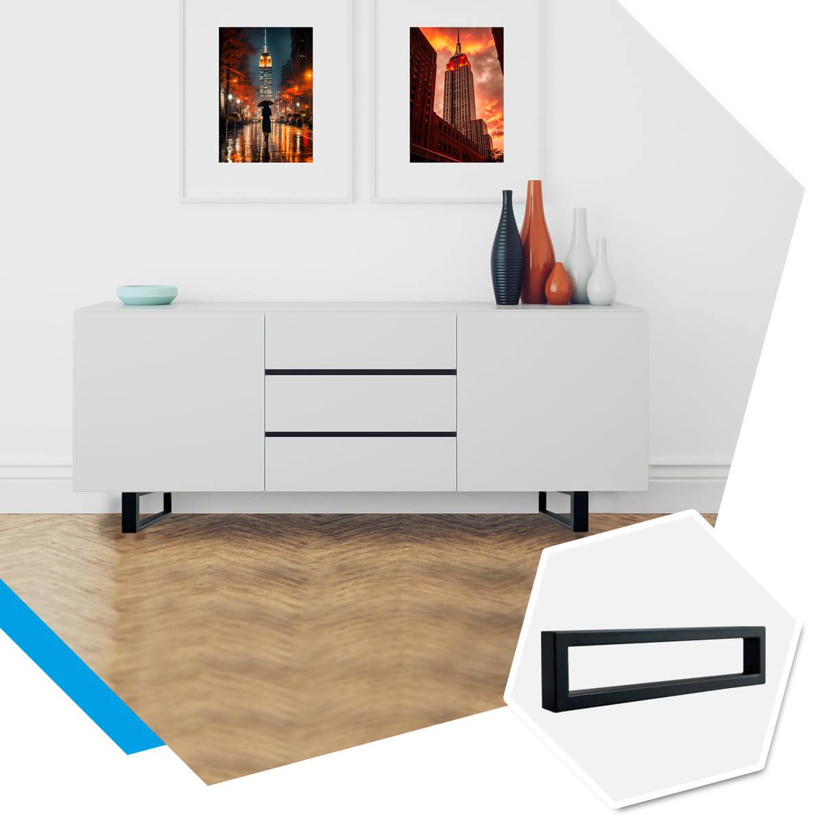 Minimalistyczne nogi meblowe STALWELD FOR HOME zaprojektowane do nowoczesnych stolików kawowych, ław, szafek RTV, komód. Wymiary 40×10 cm oraz profil 40×20 mm zapewniają lekką wizualnie bryłę przy zachowaniu wysokiej sztywności konstrukcji.