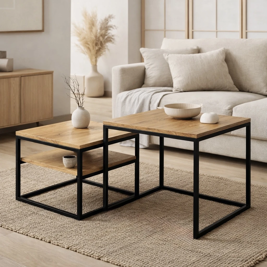 Zestaw stolików kawowych 60X60X62 i 50x50x52 z półką styl industrialny loft